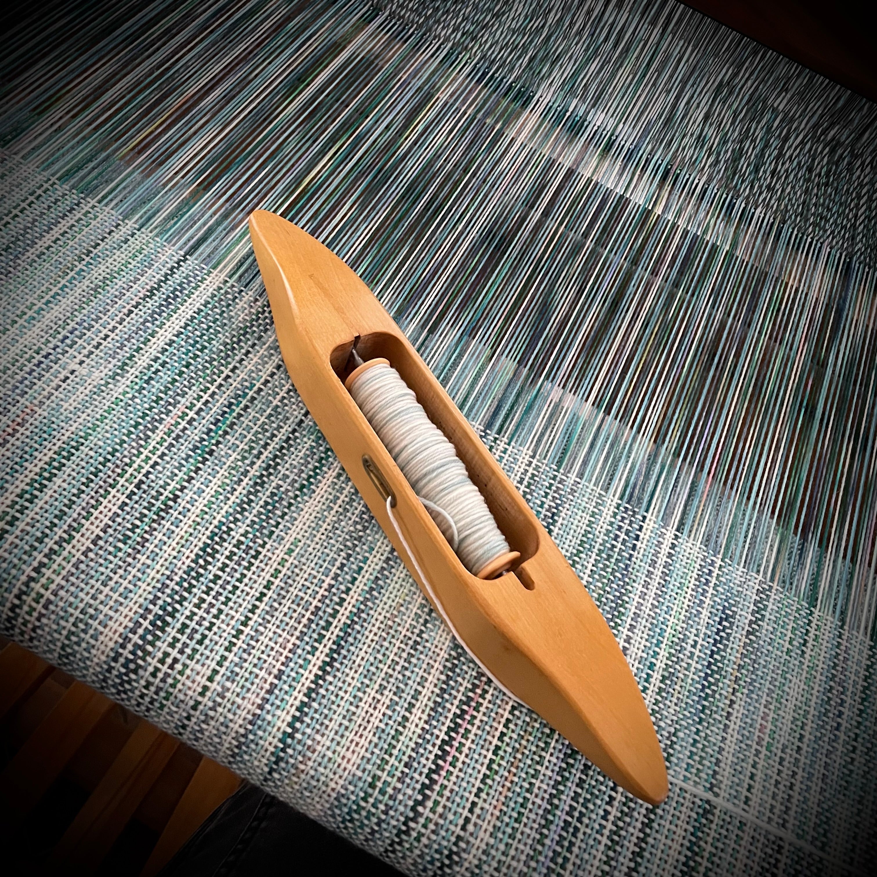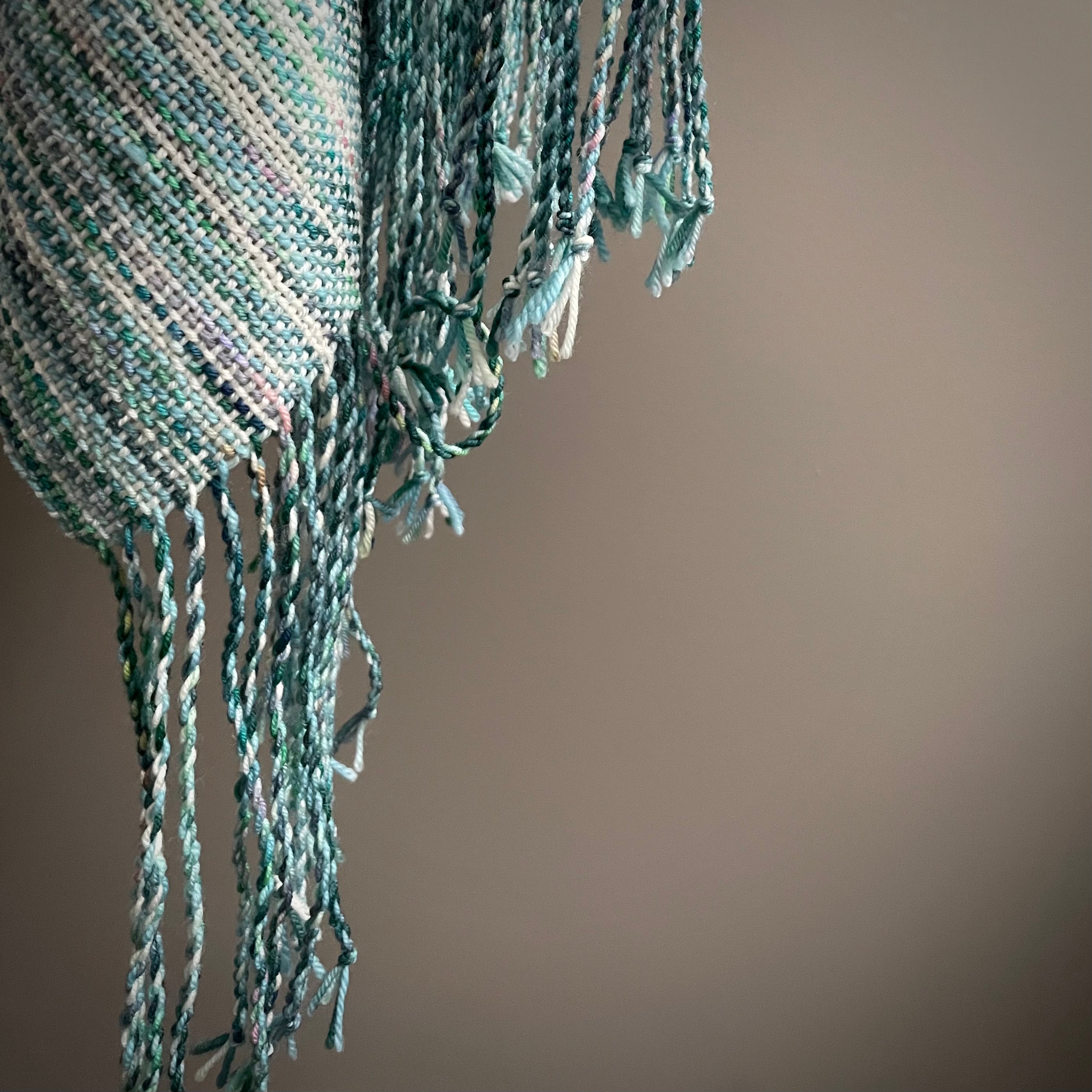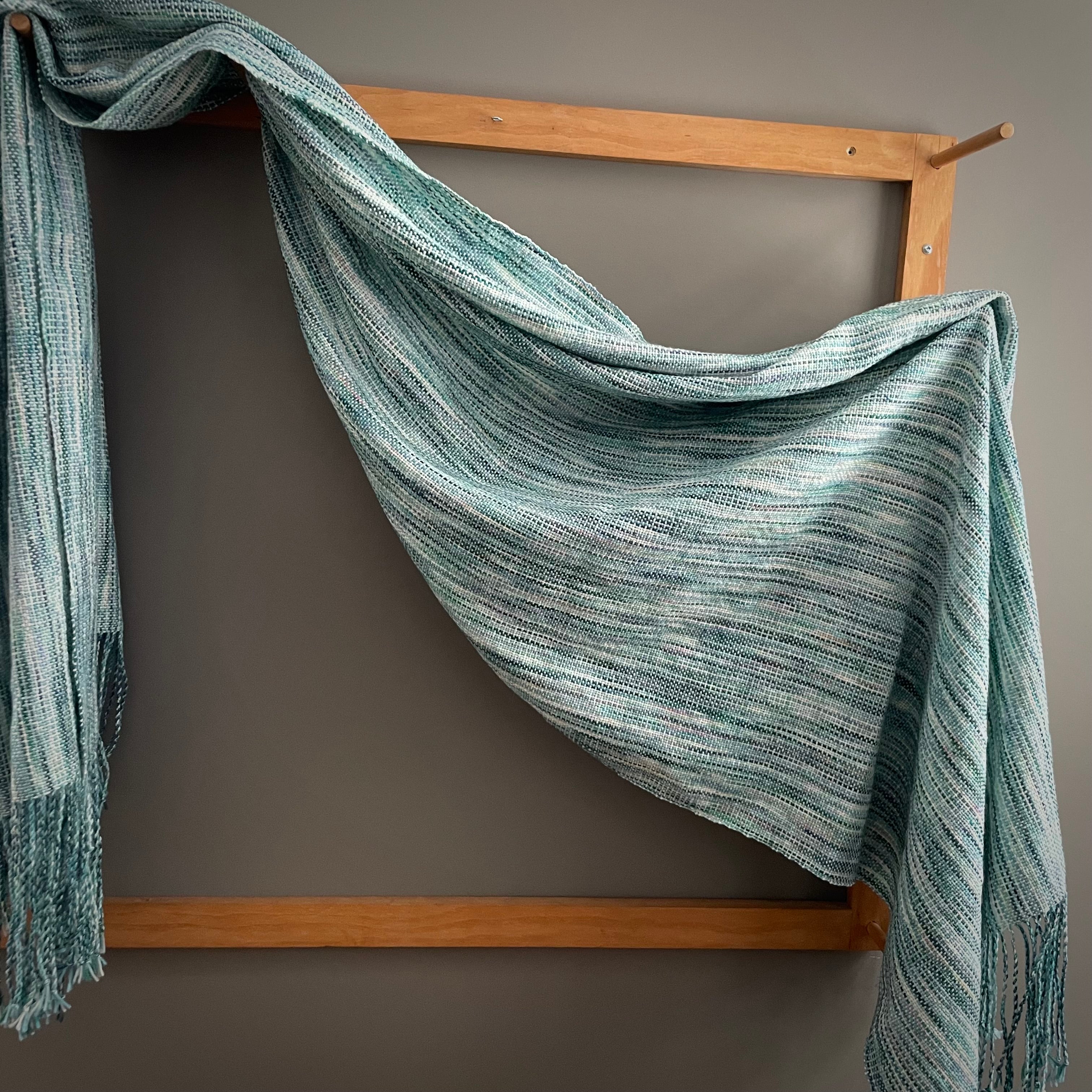 Hand painted Merino wool skeins were used to weave this shawl/throw on a traditional floor loom here at the RavensWood Studio.