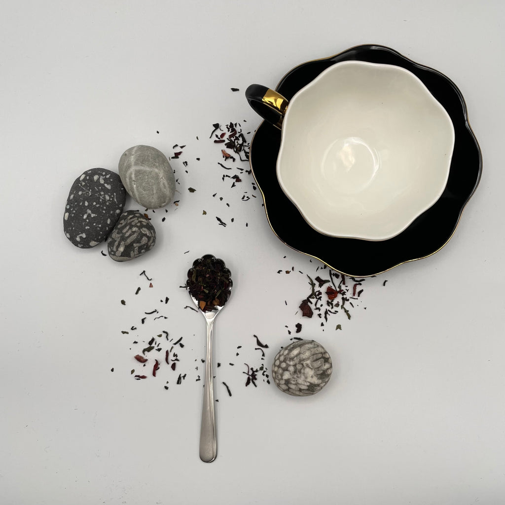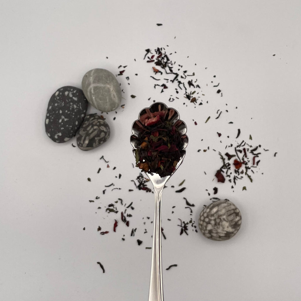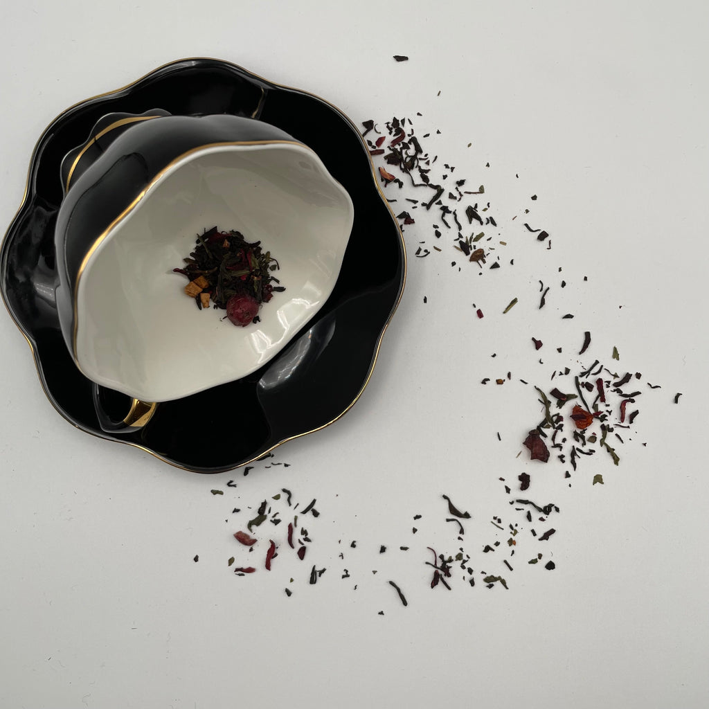 This is a loose tea that has been blended with assorted black and green teas, cherries, cranberries, hibiscus, rose hip peel, apple, grapes and rose petals.