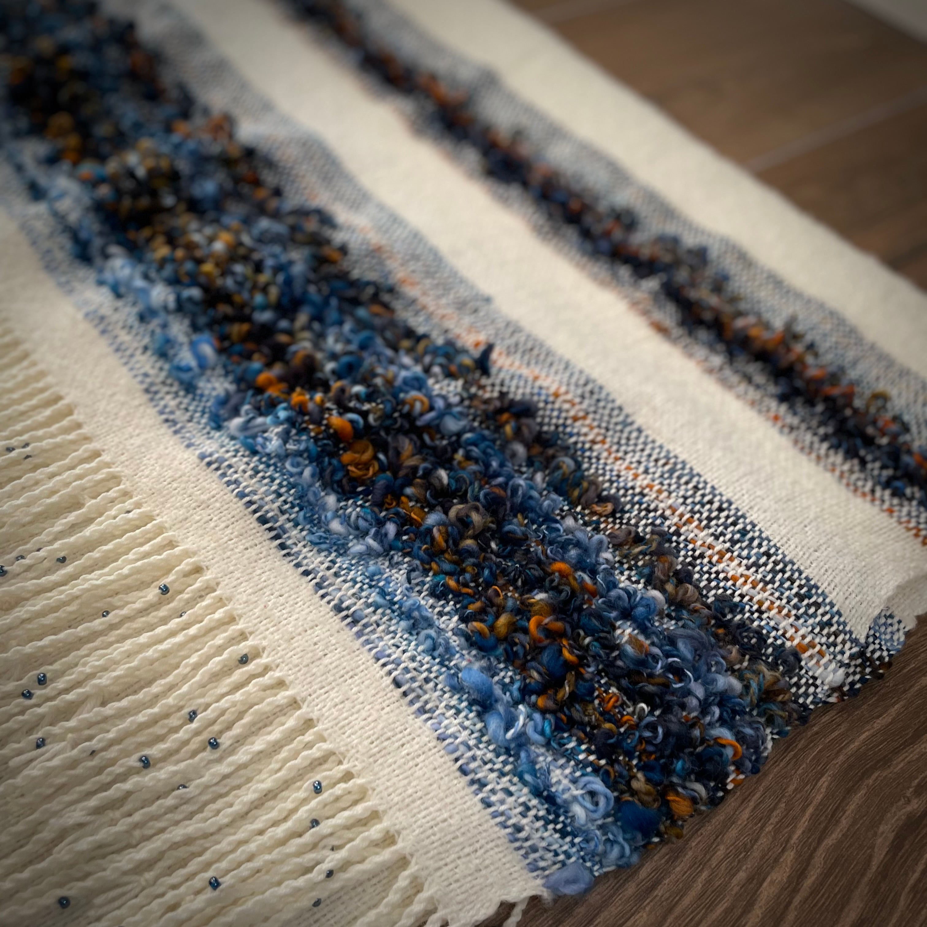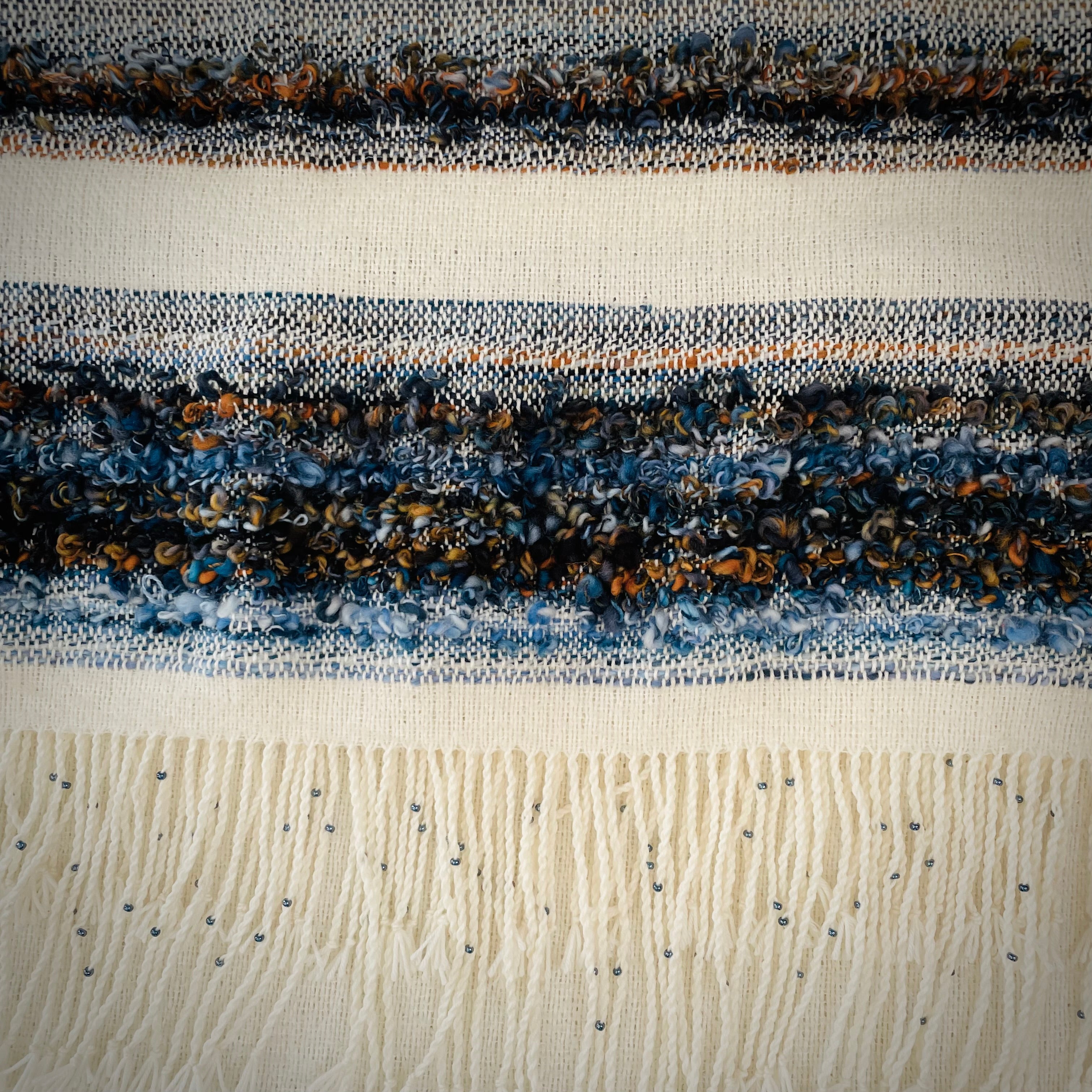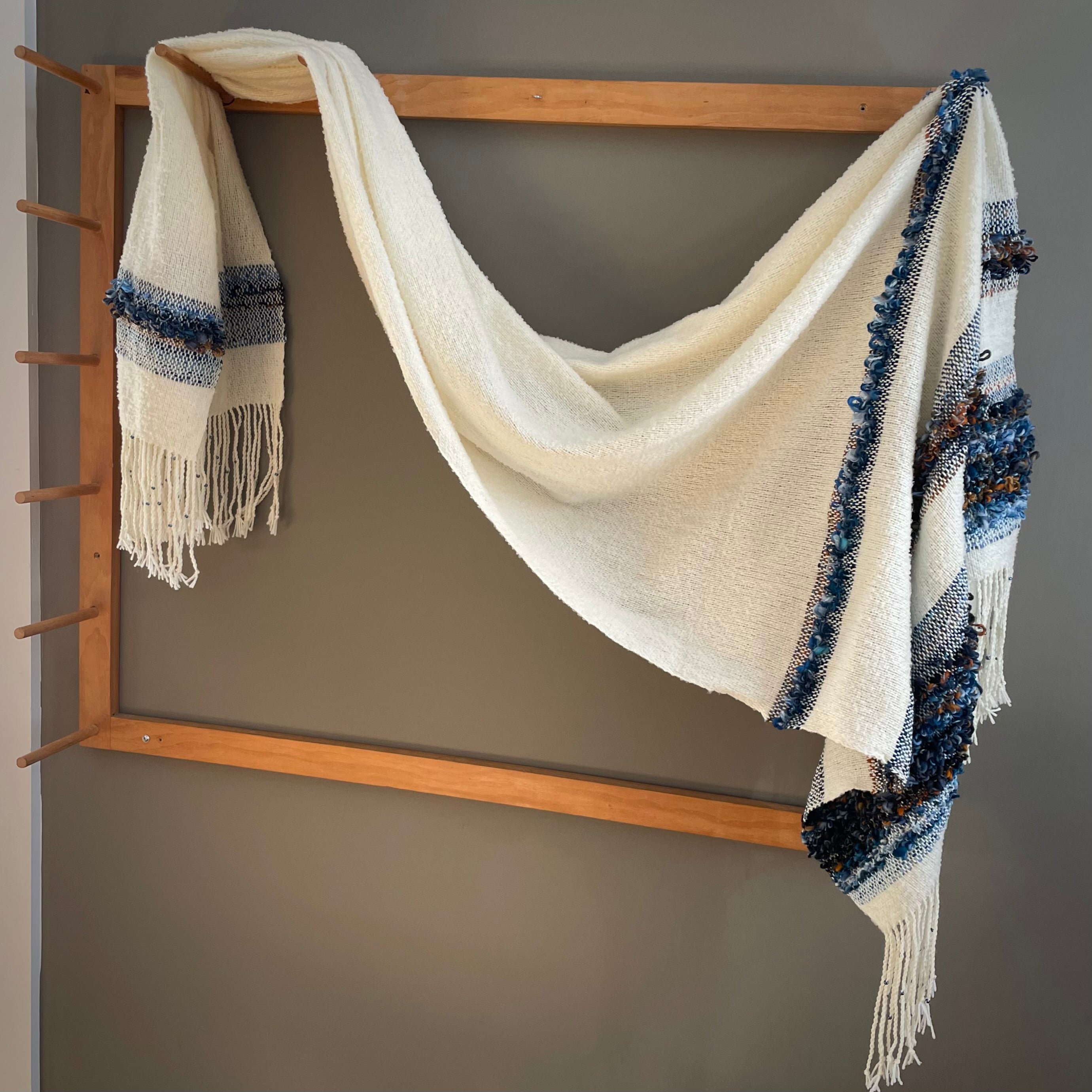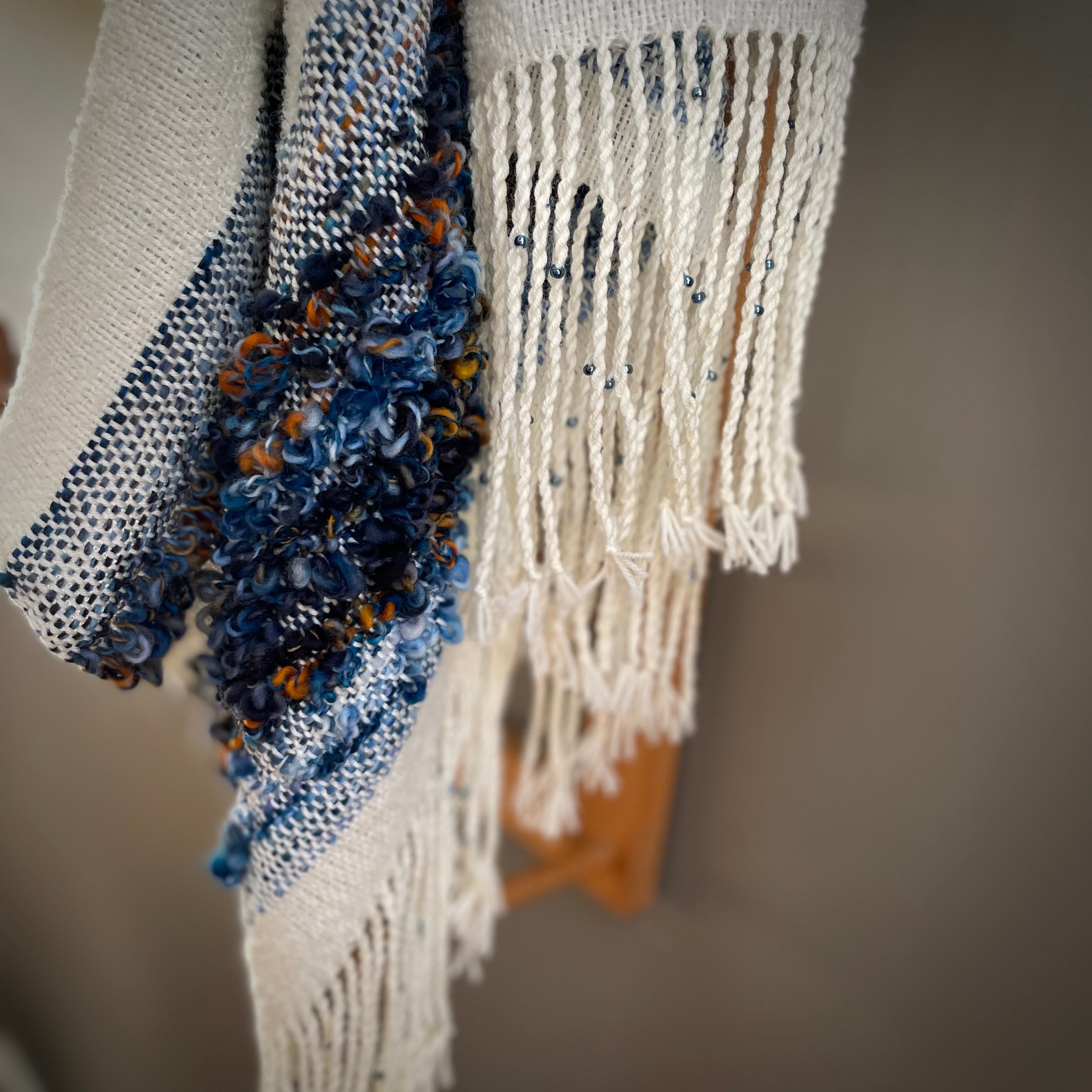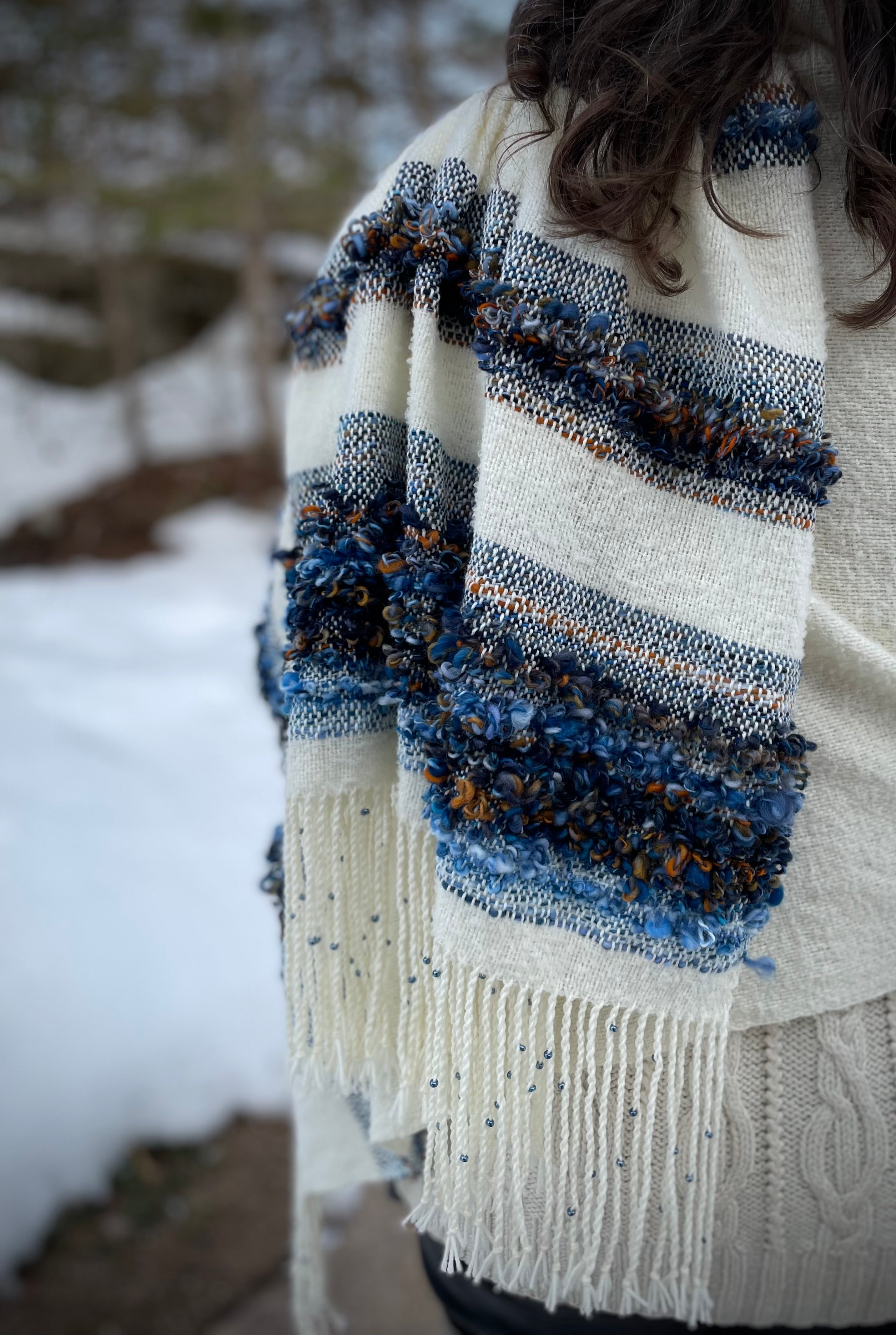 A true one of a kind piece, this shawl uses merino wool for the warp. The weft is an artful combination of merino boucle and hand spun merino/silk. The fringe is twisted with a coordinating glass bead on each tassel..